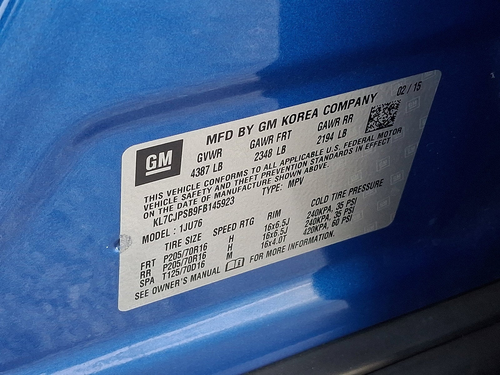 2015 Chevrolet Trax LS 6-Speed Automatic ECOTEC 1.4L I4 SMPI DOHC Turbocharged VVT *LS Package*, 16" Painted Aluminum Wheels, 2-Way Manual Front Passenger Seat Adjuster, 3.53 Final Drive Axle Ratio, 4-Wheel Disc Brakes, 6 Speakers, ABS brakes, Air Conditioning, Alloy wheels, AM/FM radio, Brake assist, Bumpers: body-color, Cloth Seat Trim, Compass, Delay-off headlights, Driver door bin, Driver vanity mirror, Driver's Seat Mounted Armrest, Dual front impact airbags, Dual front side impact airbags, Electronic Stability Control, Emergency communication system: OnStar Directions & Connections, Exterior Parking Camera Rear, Front & Rear Color-Keyed Carpeted Floormats, Front anti-roll bar, Front Bucket Seats, Front Bucket Seats w/Driver Power Lumbar, Front License Plate Bracket, Front reading lights, Front wheel independent suspension, Fully automatic headlights, Illuminated entry, Knee airbag, Low tire pressure warning, Occupant sensing airbag, Outside temperature display, Overhead airbag, Panic alarm, Passenger door bin, Passenger vanity mirror, Power door mirrors, Power steering, Power windows, Premium audio system: Chevrolet MyLink, Radio data system, Radio: Chevrolet MyLink AM/FM Stereo, Rear seat center armrest, Rear side impact airbag, Rear window defroster, Rear window wiper, Remote keyless entry, Security system, Speed-sensing steering, Split folding rear seat, Spoiler, Steering wheel mounted audio controls, Tachometer, Telescoping steering wheel, Tilt steering wheel, Traction control, Trip computer, Variably intermittent wipers. AWD 4D Sport Utility Brilliant Blue Metallic