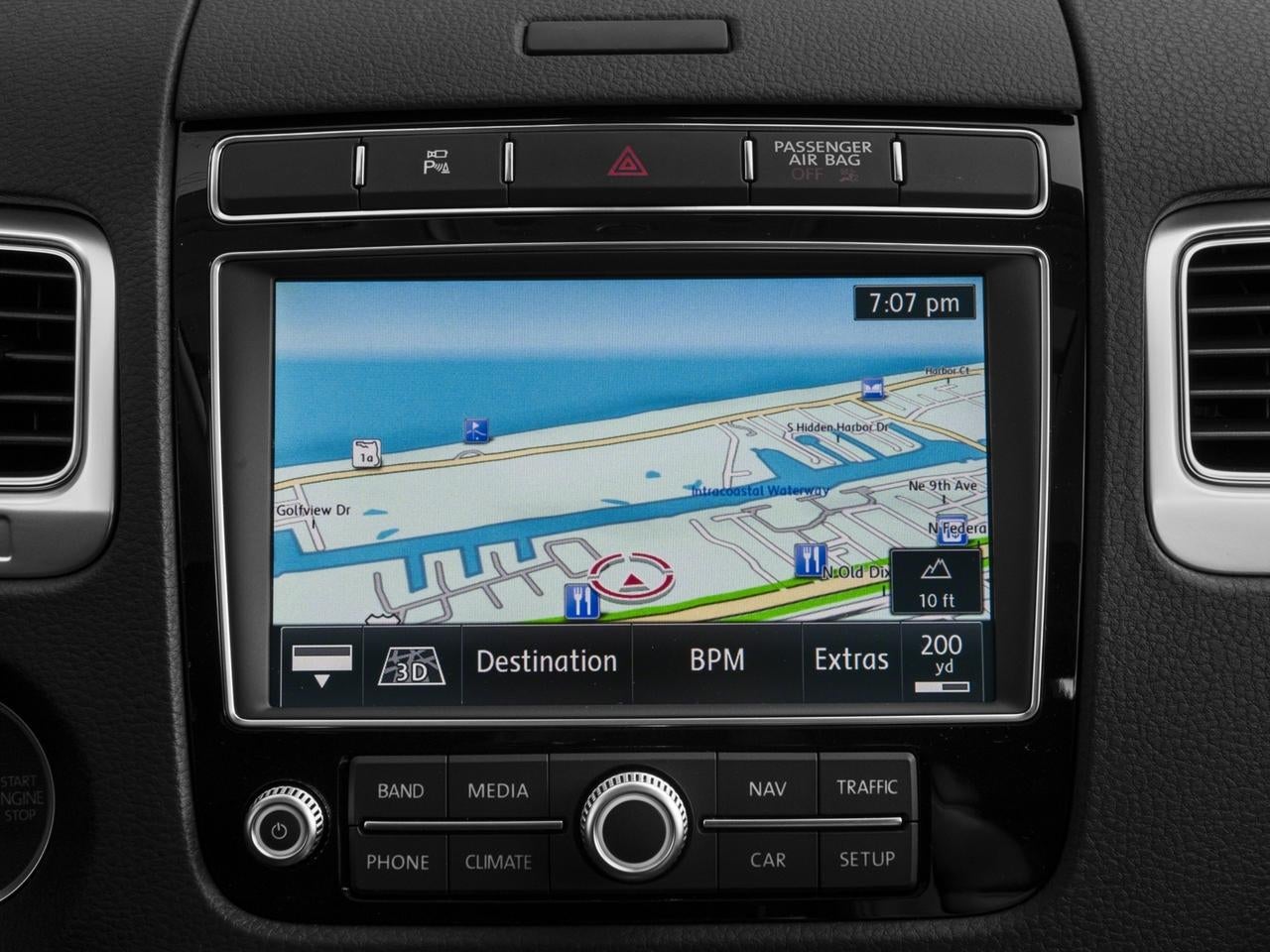 Step inside the Touareg and you'll be greeted by a spacious and well-appointed cabin, featuring V-Tex leatherette seating surfaces, a leather-wrapped steering wheel, and a host of advanced technology features. The RNS 850 Navigation and Infotainment System keeps you connected and entertained, while the Bi-Xenon headlights and rain-sensing wipers enhance visibility and convenience.